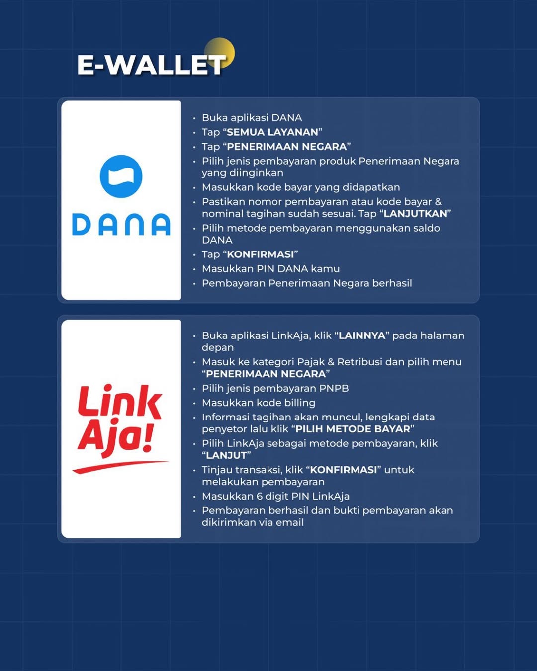 Dompet digital seperti DANA dan LinkAja (melalui menu Pembayaran MPN)